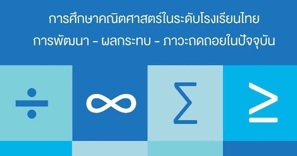 การศึกษาคณิตศาสตร์ในระดับโรงเรียนไทย : การพัฒนา – ผลกระทบ – ภาวะถดถอยในปัจจุบัน 30 ธันวาคม 2558 แก้ไขล่าสุดเมื่อ: (แก้ไข 26 กรกฎาคม 2020)