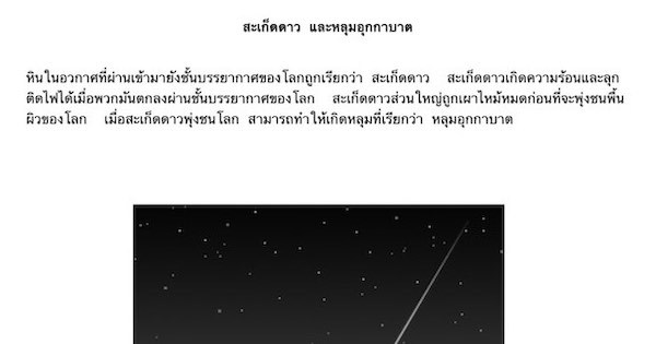 หินในอวกาศที่ผ่านเข้ามายังชั้นบรรยากาศของโลกถูกเรียกว่า สะเก็ดดาว สะเก็ดดาวเกิดความร้อนและลุกติดไฟได้เมื่อพวกมันตกลงผ่านชั้นบรรยากาศของโลก สะเก็ดดาวส่วนใหญ่ถูกเผาไหม้หมดก่อนที่จะพุ่งชนพื้นผิวของโลก เมื่อสะเก็ดดาวพุ่งชนโลก สามารถทำให้เกิดหลุมที่เรียกว่า หลุมอุกกาบาต